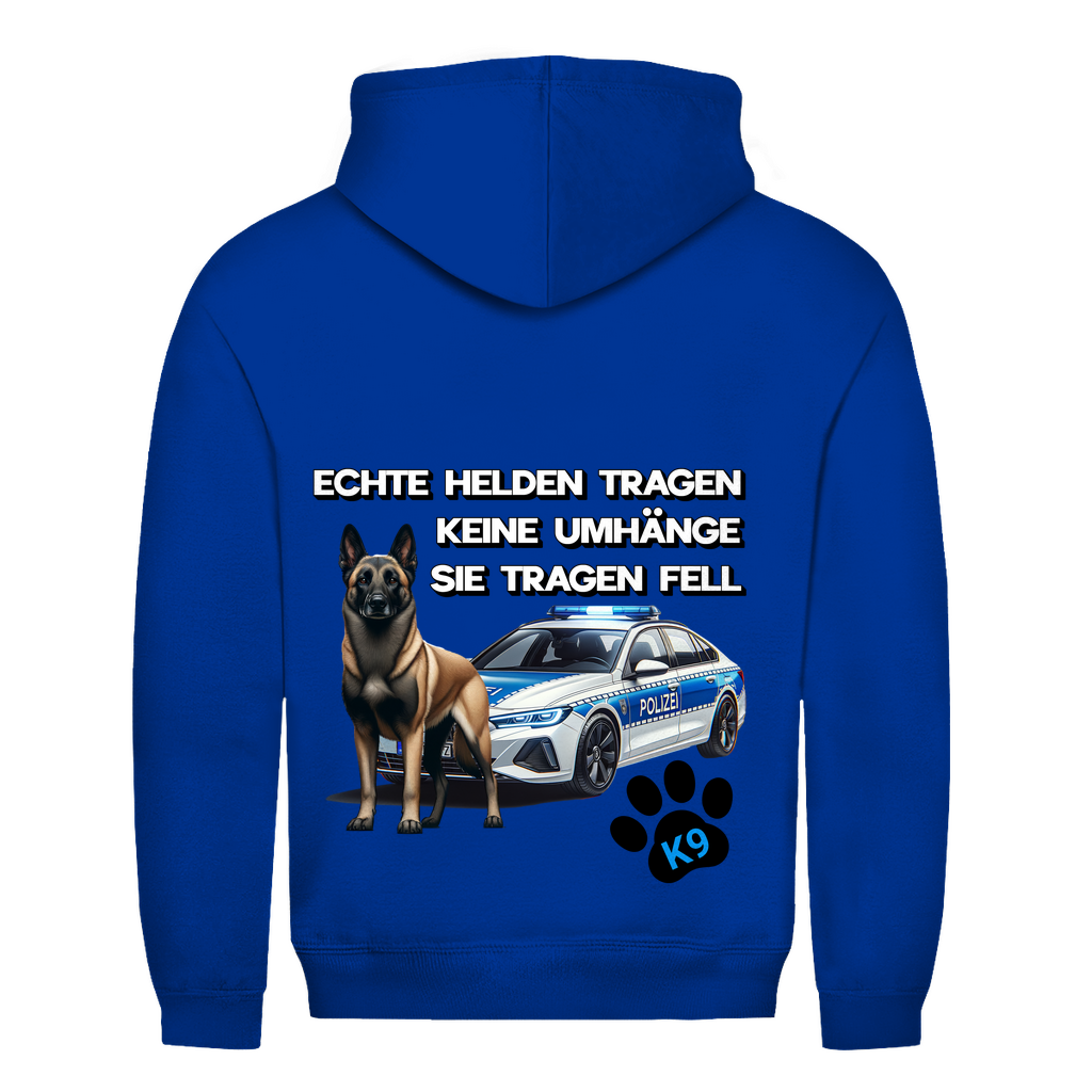 Dieser stylische K9 Hoodie ist ein Must-have für alle, die ihre Wertschätzung für Diensthunde zeigen wollen! Das kraftvolle Design mit einem beeindruckenden Malinois vor einem Streifenwagen, ergänzt durch eine markante Pfote mit K9-Schriftzug, setzt ein starkes Statement. Der inspirierende Spruch "Echte Helden tragen keine Umhänge, sie tragen Fell." macht diesen Hoodie perfekt für Hundeführer, Polizeibeamte und K9-Fans.